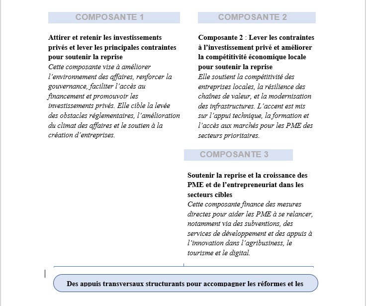 Pour garantir la mise en œuvre cohérente, durable et inclusive de ses composantes, le projet PIC s’appuie sur un ensemble d’appuis transversaux essentiels portant sur :